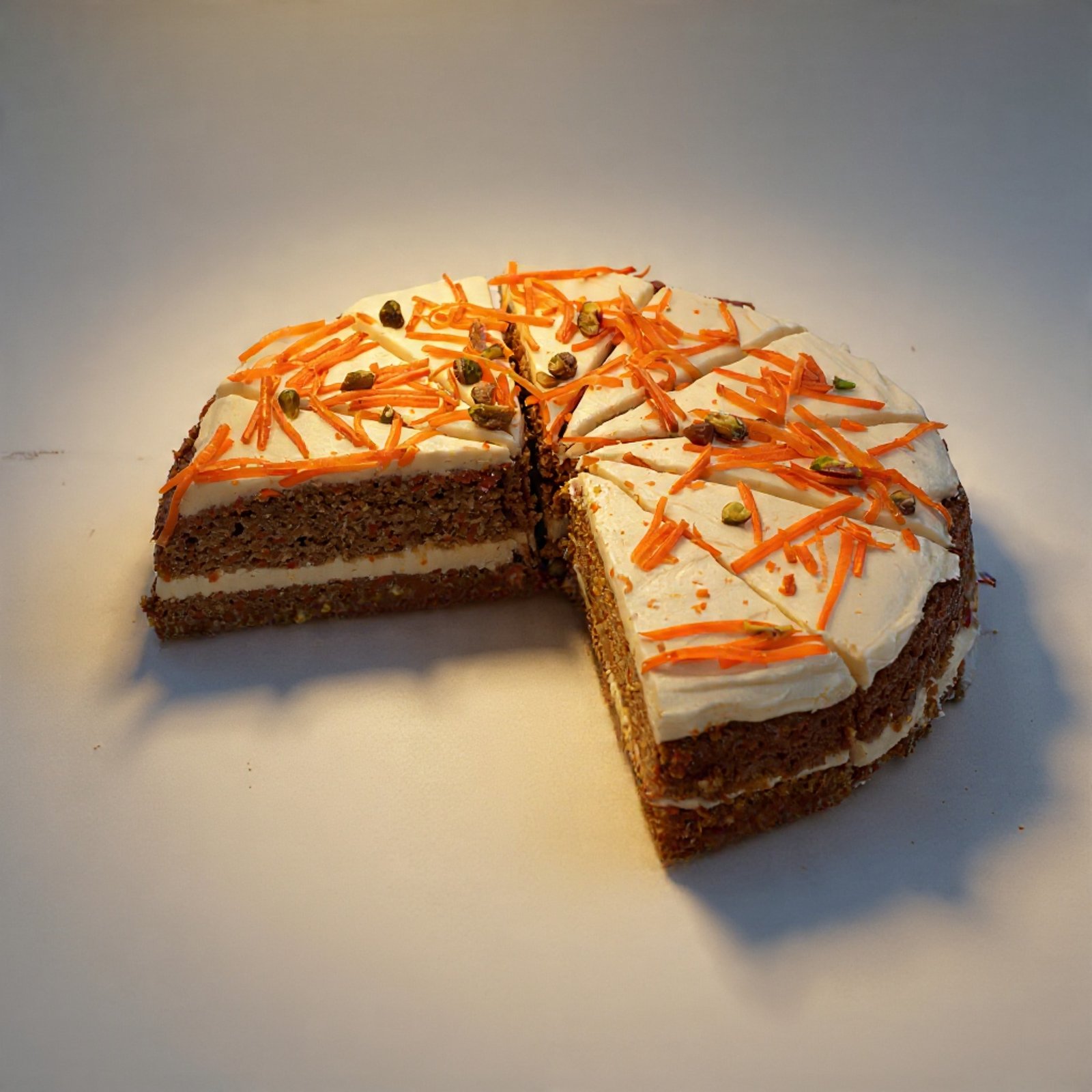 Smeuïge worteltaart met kruiden, voorgesneden in 12 punten.